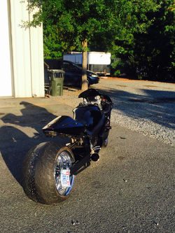 Custom built 360 rear swing arm, lowered with chrome wheels, custom side exhaust, LEDs, rearview camera, and paint.